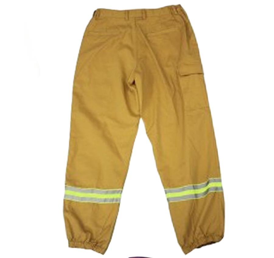 Quần chữa cháy Mẫu số 2: Quần dài ống rộng, cạp quần rộng 4,5 cm có thun co giãn hai bên hông và 06 vắt xăng, cửa quần có dắt kéo theo chiều thẳng đứng, có cúc dài nằm ẩn bên trong. Thân trước quần có hai túi chéo đắp nổi, bên phải trước ống quần phía gần đầu gối có hai túi hộp, hai bên đùi đầu gối có hai đệm lót, từ trước ra sao ống quần có một dãy phản quang màu xanh nằm giữa nền màu xám khổ rộng 5 cm, gấu quần bể 2 cm, thân sau hai bên quần có 2 túi. |